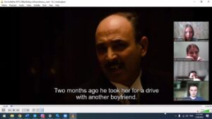 Олександра Бурбенко, студентка 1 курсу, природничо-економічного факультету: “Ми обрали тему сьогоднішньої розмови – “Let’s go to the movies”. В завданнях були запитання, на які ми відповідали. Наприклад, який улюблений фільм, улюблена актриса? Чи вважаєте ви піртські фільми злочином? Який фільм ви знімали б? тощо. Алекс розділяв нас по групах, рандомних, і ми відповідали, ніби діалог між людьми, інколи жартували. Потім всі разом один одному рекомендували фільми. Він нам порекомендував фільм “Крестный отец” (“The Godfather”) і показав фрагмент“.